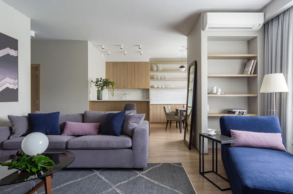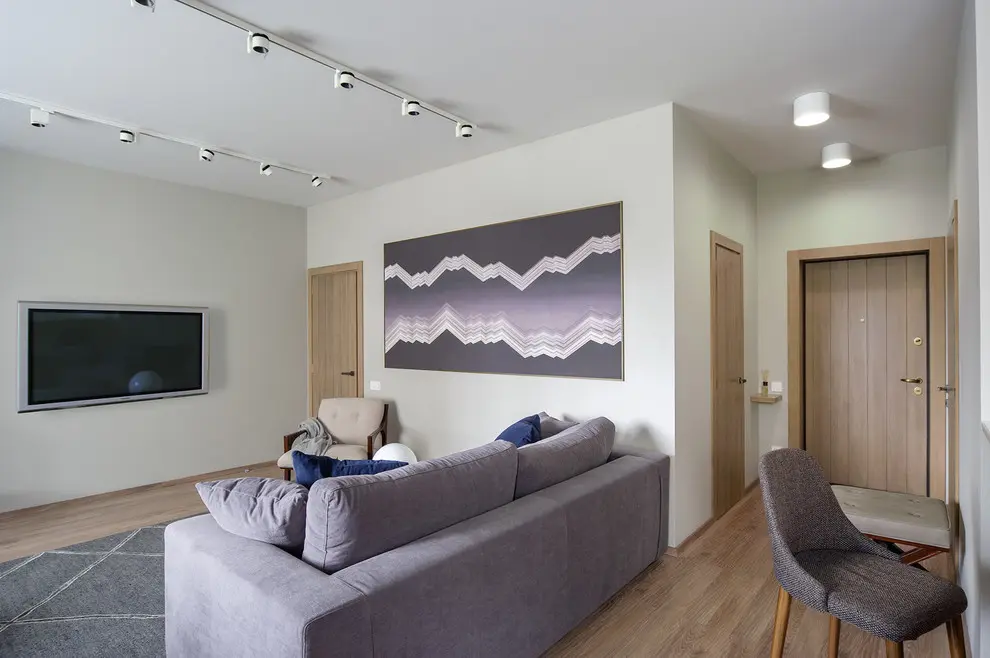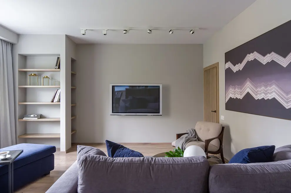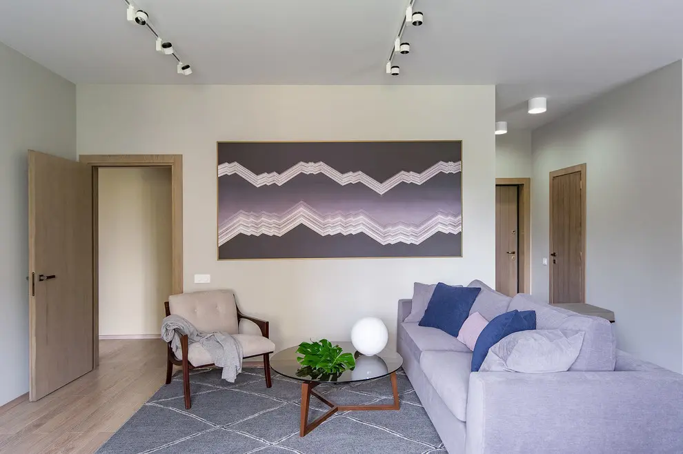 Daca in bucatarie am intalnit elemente in culori neutre, living-ul ne aduce un plus de culoare. Central regasim o canapea si un fotoliu extensibil in tonuri de gri, albastru si mov lila. Pentru armonizarea decorului cu celelalte incaperi, se pastreaza etajerele din bucatarie. Si, fiind necesara adaugarea un accent modern, se va evidentia un canvas de mari dimensiuni in culorile mobilei.