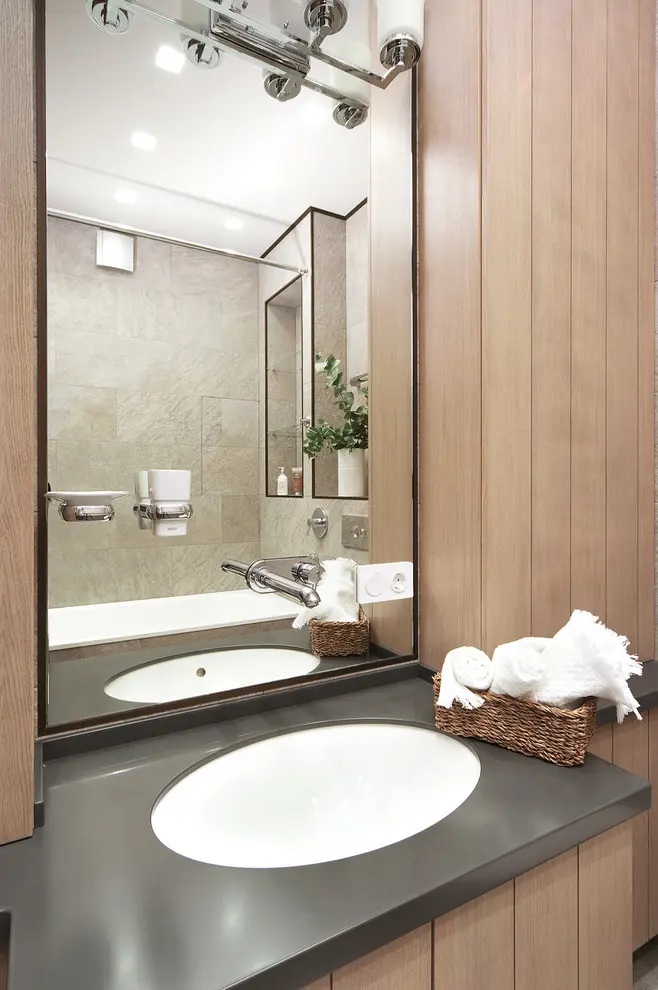 Pentru o baie mica, vom pune accent pe geometrie iar liniile vor fi cele care vor salva spatiul. Placile de lemn asezate pe lung pe toata suprafata, oglinda generoasa si profilele ascutite iti vor mari vizual incaperea si vor avea ca rezultat o baie moderna si contemporana.