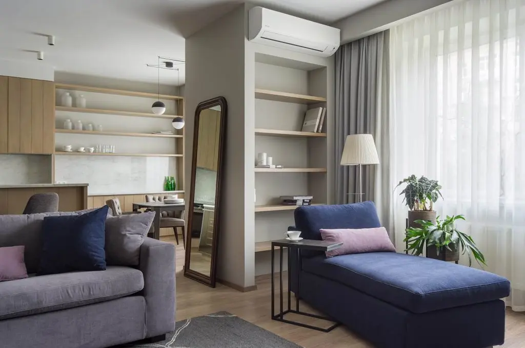 Trecerea catre living este de aceasta data semnalata subtil de catre o oglinda cu rama din lemn, de mari dimensiuni, pozitionata opus usii de la intrare, oglinda ce va crea iluzia de alungire a unui hol despartitor.