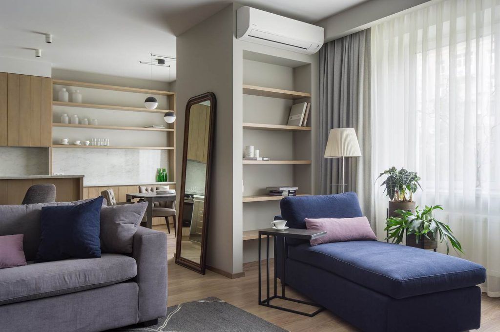 Daca in bucatarie am intalnit elemente in culori neutre, living-ul ne aduce un plus de culoare. Central regasim o canapea si un fotoliu extensibil in tonuri de gri, albastru si mov lila. Pentru armonizarea decorului cu celelalte incaperi, se pastreaza etajerele din bucatarie. Si, fiind necesara adaugarea un accent modern, se va evidentia un canvas de mari dimensiuni in culorile mobilei.