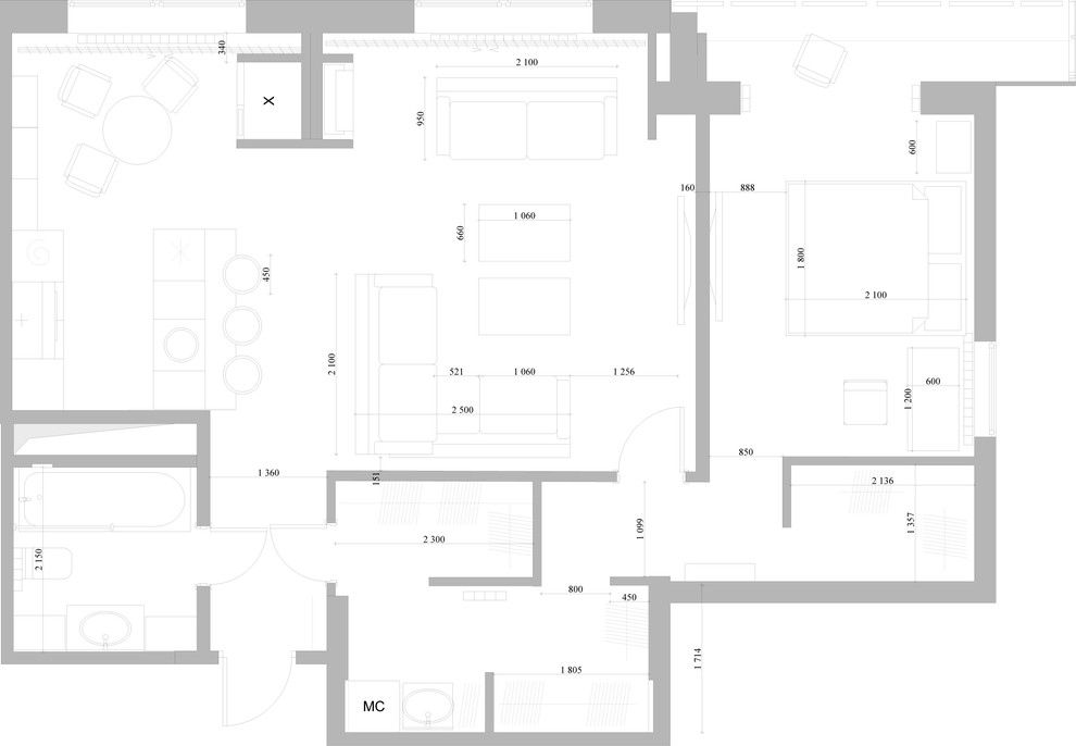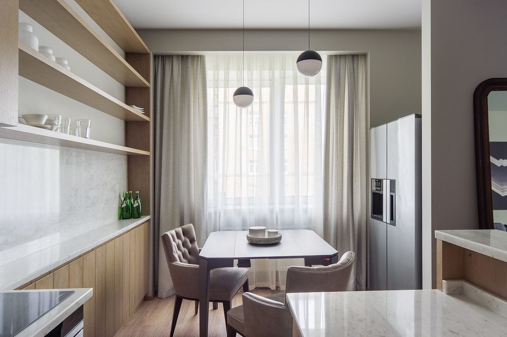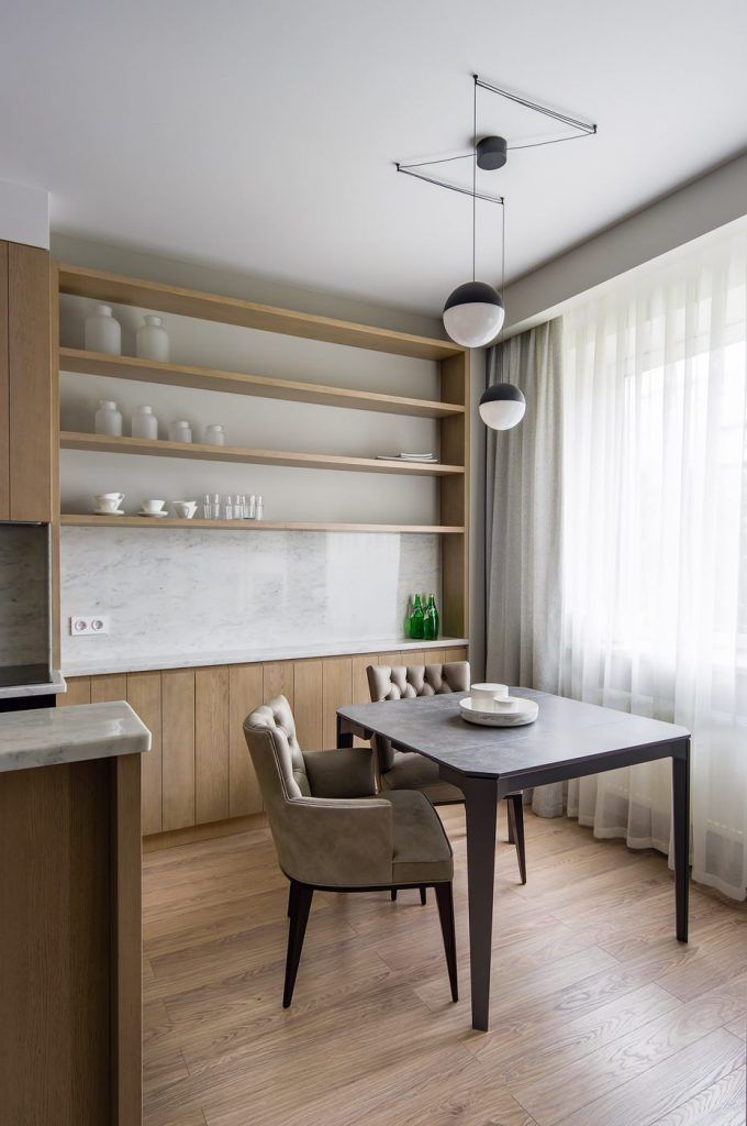Pentru armonizarea acesteia cu living-ul spatiile de depozitare se vor aseza sub forma unor etajere, iar scaunele din jurul mesei, cu un design vintage, vor sparge tiparele geometrice ale scaunelor uzuale de bucatarie.