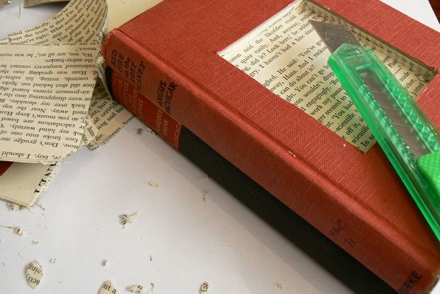 Al doilea pas este sa marcati zona pe care o veti taia. Trasati cu creionul un patrat sau un dreptunghi si apoi folositi un cutter ascutit si rezistent pentru a taia cartile.