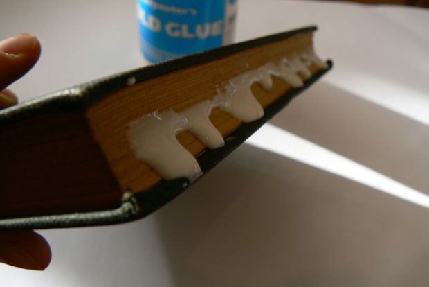 Primul pas, la fel ca in imagini este sa tineti cartea (sau cartile, depinde cat de inalt vreti sa fie ghiveciul) inchisa si sa aplicati aracetul/adezivul pe marginile sale pentru a lipi paginile si pentru a rigidiza structura.