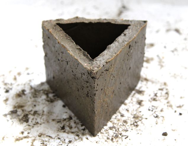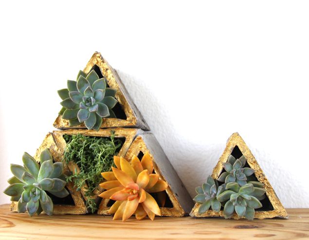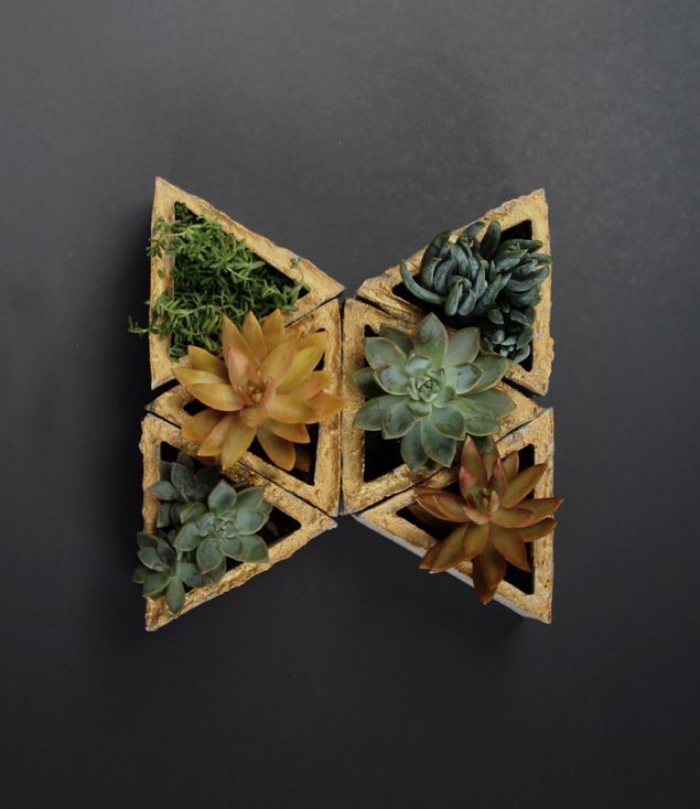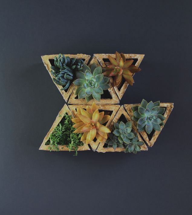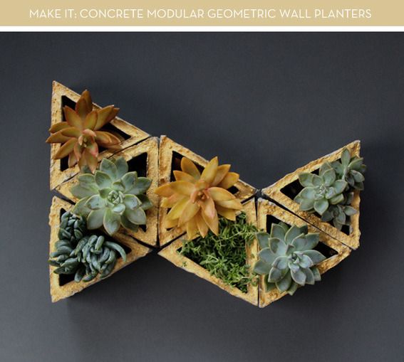 Fiecare ghiveci de perete este realizat din beton. Cele din imaginile de mai sus, realizate de Ananda, arhitect peisagist si proprietar al blogului apieceofrainbow au forma triunghiulara insa le puteti realiza si in alte forme geometrice cat timp va desenati un tipar corect.