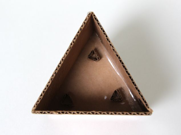 Taiati cartonul dupa tipar pentru a realiza cele doua forme de ghivece de perete, cea de exterior si cea de interior. Intre ele veti turna ulterior mixul de ciment. Dupa ce ati taiat formele, lipiti-le cu banda adeziva ca in imaginile de mai sus. Forma de carton exterioara va trebui sa aiba si trei orificii pentru a forma si gaurile de scurgere si de prindere ale ghivecelor de perete.
