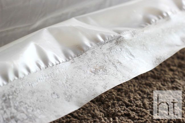 Deschide GaleriaAveti nevoie de o rola de plastic gros, hartie pergament (la fel ca hartia pentru gatit), de un fier de calcat si de o sursa de apa. Pentru inceput, intindeti o bucata lunga de pergament si impaturiti-o in doua. Trasati pe aceasta o linie la distanta de 4 centimetri de margine. Acesta este marcajul pentru a sti cat din pergament va fi calcat cu fierul. Desfasurati rola de plastic, in functie de cat de mare vreti sa faceti salteaua cu apa. Impaturiti-o in doua.