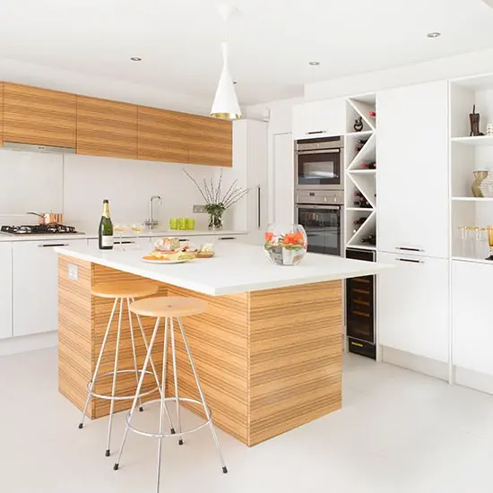Mixul dintre alb si lemn este intotdeauna unul castigator. Mizeaza pe o astfel de imbinare pentru o bucatarie moderna