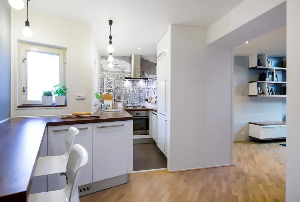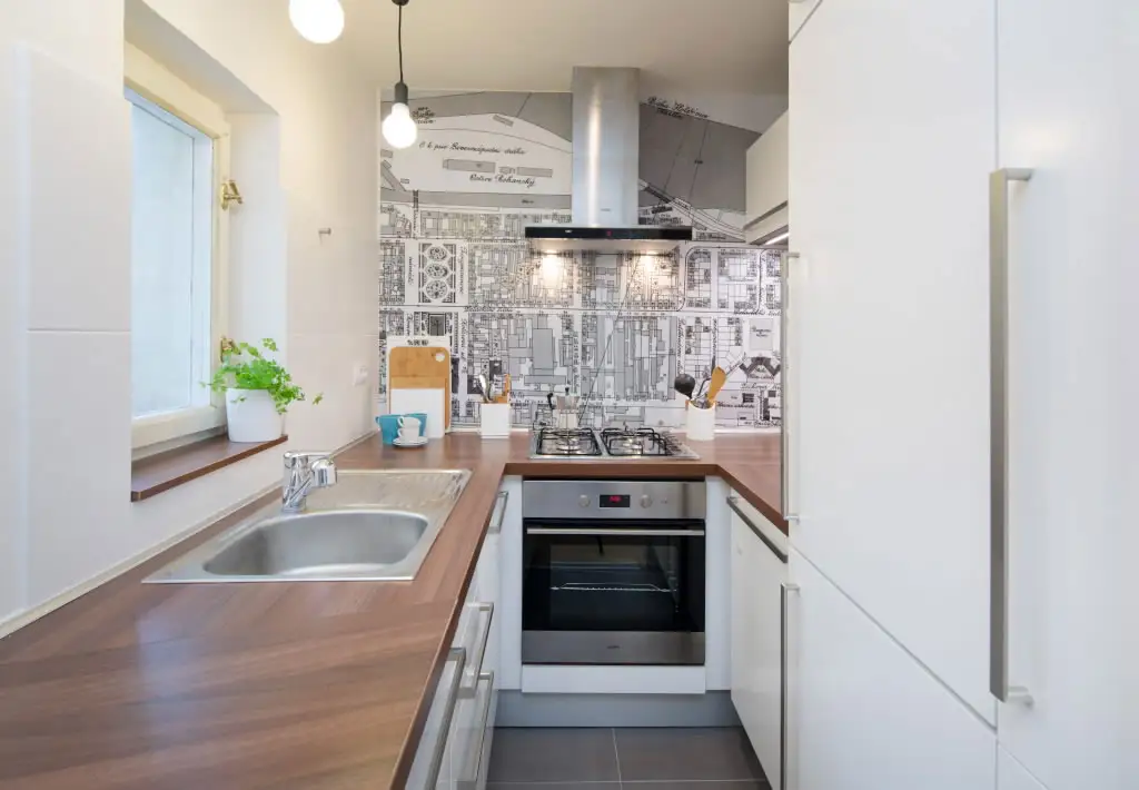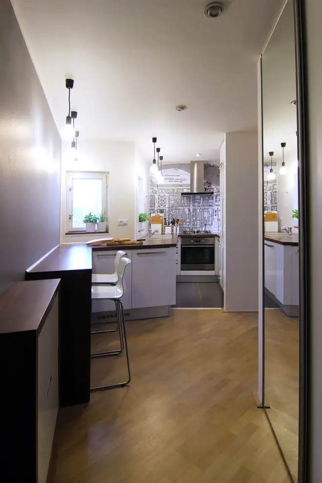 Dispunerea pe toate laturile disponibile, a facut posibila o asezare coerenta in care o persoana poate gati fara probleme. Plita, cuptor, hota, ba chiar si spatiu pe blatul de lucru, iata cum poti scoate maximum dintr-o bucatarie foarte mica. Grafismul de pe peretele cu hota distrage atentia de la dimensiunile spatiului si creeaza o zona de accent binevenita.