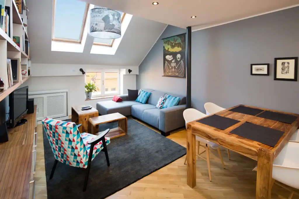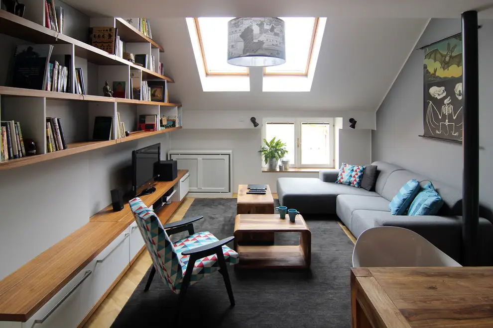 Camera principala sau livingul descrie un decor gandit sa ofere maximum de eficienta intr-o configuratie dificila, cu tavan inclinat. Ferestrele specifice mansardelor aduc un plus de lumina naturala in camera si iti ofera privilegiul de a admira imensitatea cerului. Restul camerei urmeaza o linie minimalista necesara in contextul suprafetei mici.