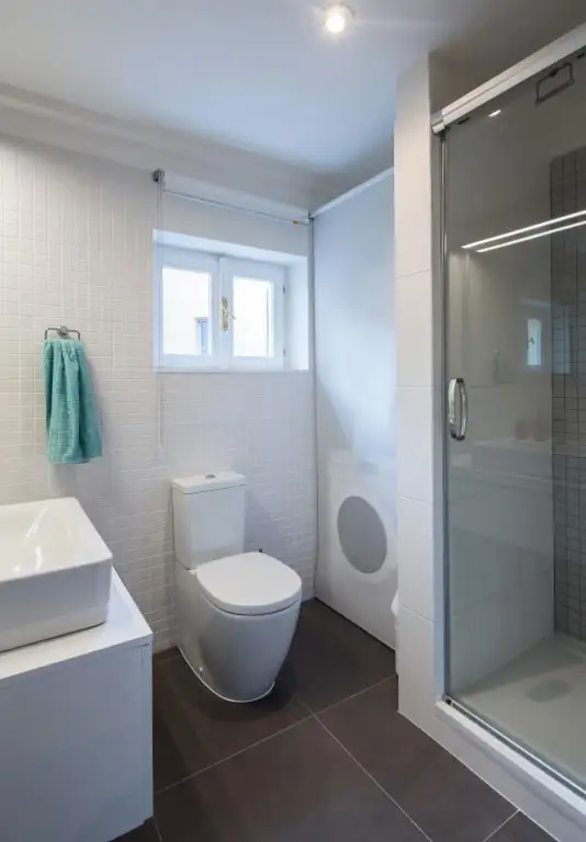 Baia a fost gandita cat mai functional posibil, din nevoia de a integra si masina de spalat rufe. Pe de o parte avem conturata zona de dus, delimitata printr-un perete despartitor de spatiul destinat masinii (vezi modul ingenios prin care este ascunsa atunci cand nu este folosita) si de cealalta parte, spatiul toaletei si al lavoarului.