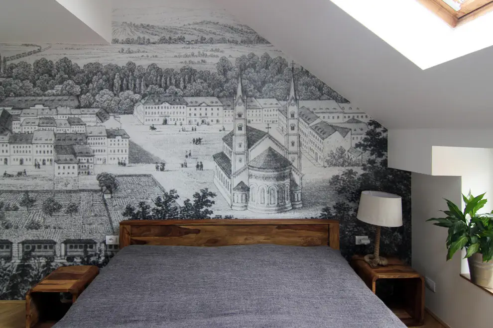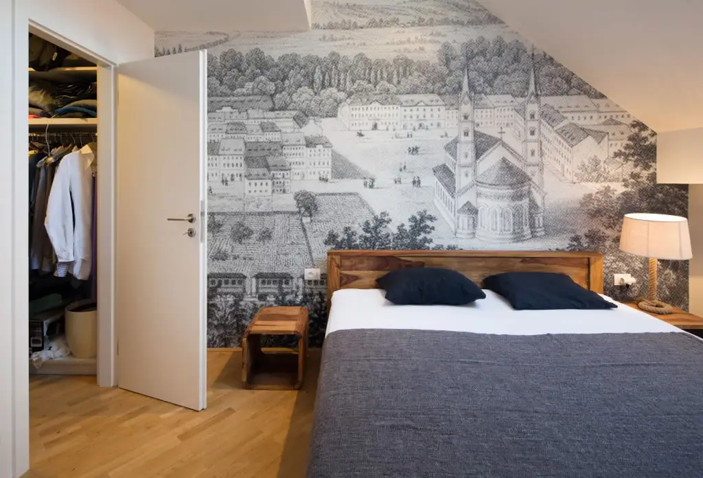 Si pentru dormitor se pastreaza ideea de minimalism. Aspectul de lemn nefinisat al cadrului patului si tapetul reprezentand o harta veche cu centrul orasului Karlin din Cehia, locul unde se afla acest imobil, sunt piese care vorbesc despre pasiunea pentru arta si detalii antice ale beneficiarului. Exista si un dressing amenajat intr-o fosta camara ceea ce ofera mai mult spatiu de circulat.