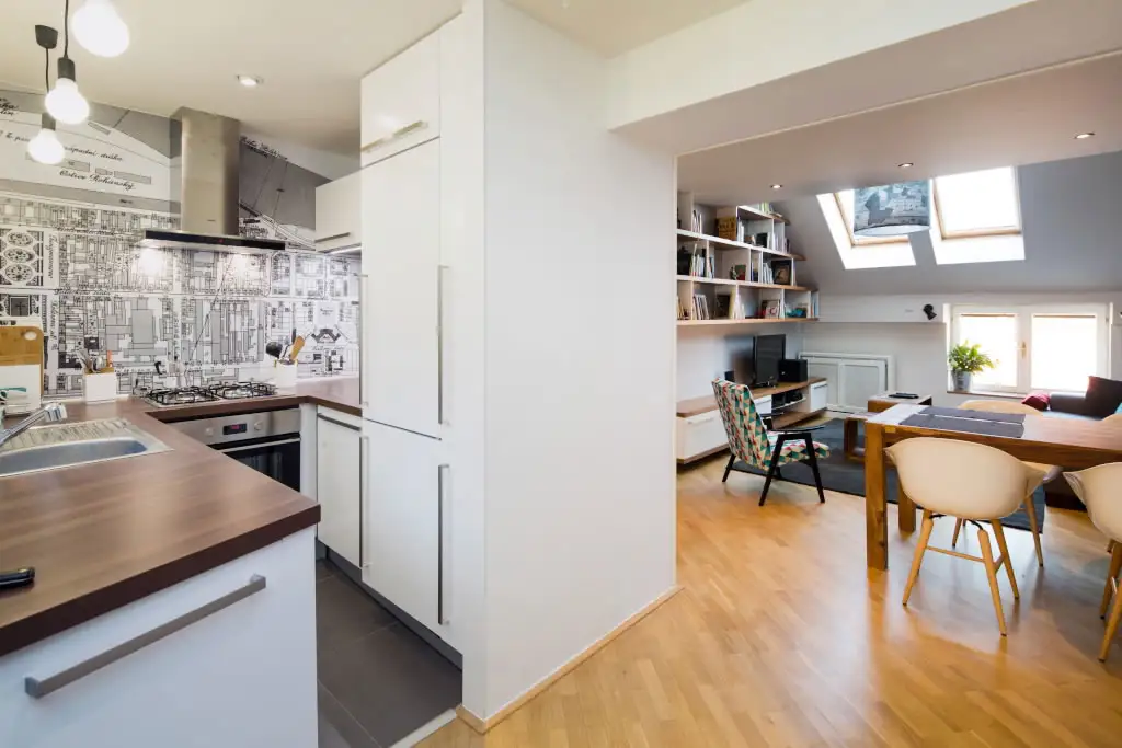 Spre deosebire de living, bucataria se afla in partea cu tavan jos; nici suprafata nu este una prietenoasa. Cu toate acestea, avem o zona de gatit functionala in doar 3,7 metri patrati. Deschizand bucataria spre camera, au mai fost integrate dulapuri si creata o nisa pentru a incastra frigiderul.