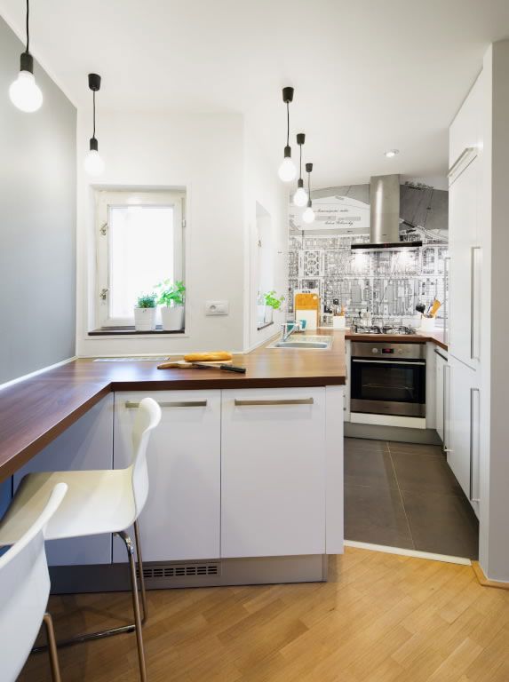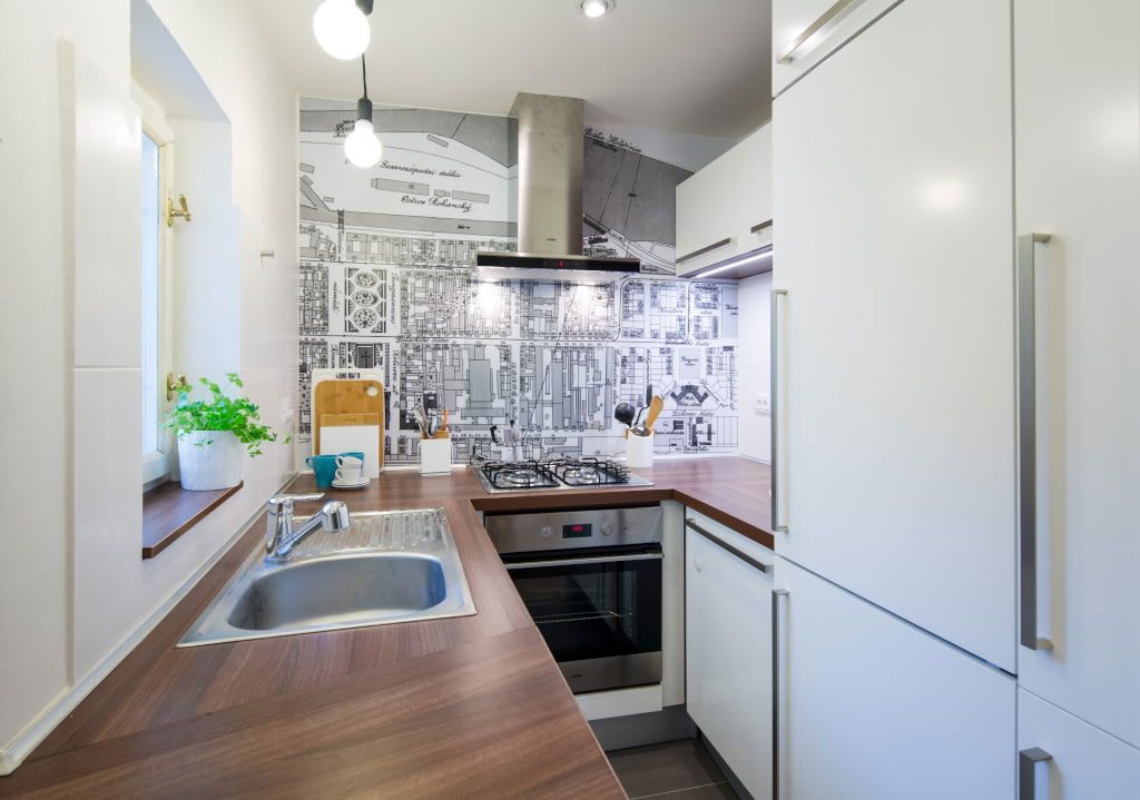Dispunerea pe toate laturile disponibile, a facut posibila o asezare coerenta in care o persoana poate gati fara probleme. Plita, cuptor, hota, ba chiar si spatiu pe blatul de lucru, iata cum poti scoate maximum dintr-o bucatarie foarte mica. Grafismul de pe peretele cu hota distrage atentia de la dimensiunile spatiului si creeaza o zona de accent binevenita.