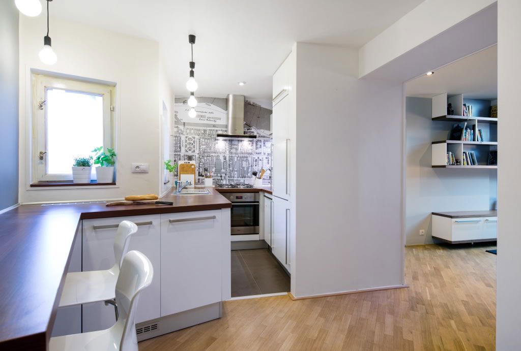 La nivelul spatiului apartamentului au fost aduse mici modificari in scopul optimizarii bucatariei. Astfel, incaperea a fost deschisa spre camera de zi adaugand un loc de luat masa tip bar si mai multe spatii de depozitare.