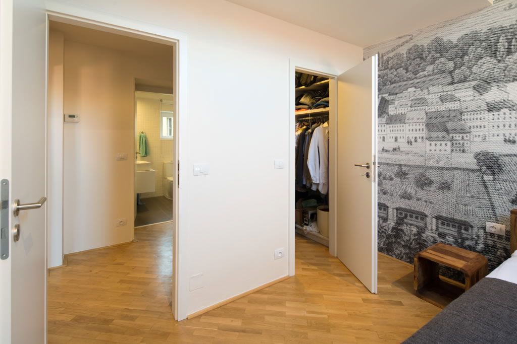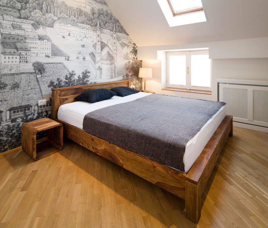 Si pentru dormitor se pastreaza ideea de minimalism. Aspectul de lemn nefinisat al cadrului patului si tapetul reprezentand o harta veche cu centrul orasului Karlin din Cehia, locul unde se afla acest imobil, sunt piese care vorbesc despre pasiunea pentru arta si detalii antice ale beneficiarului. Exista si un dressing amenajat intr-o fosta camara ceea ce ofera mai mult spatiu de circulat.