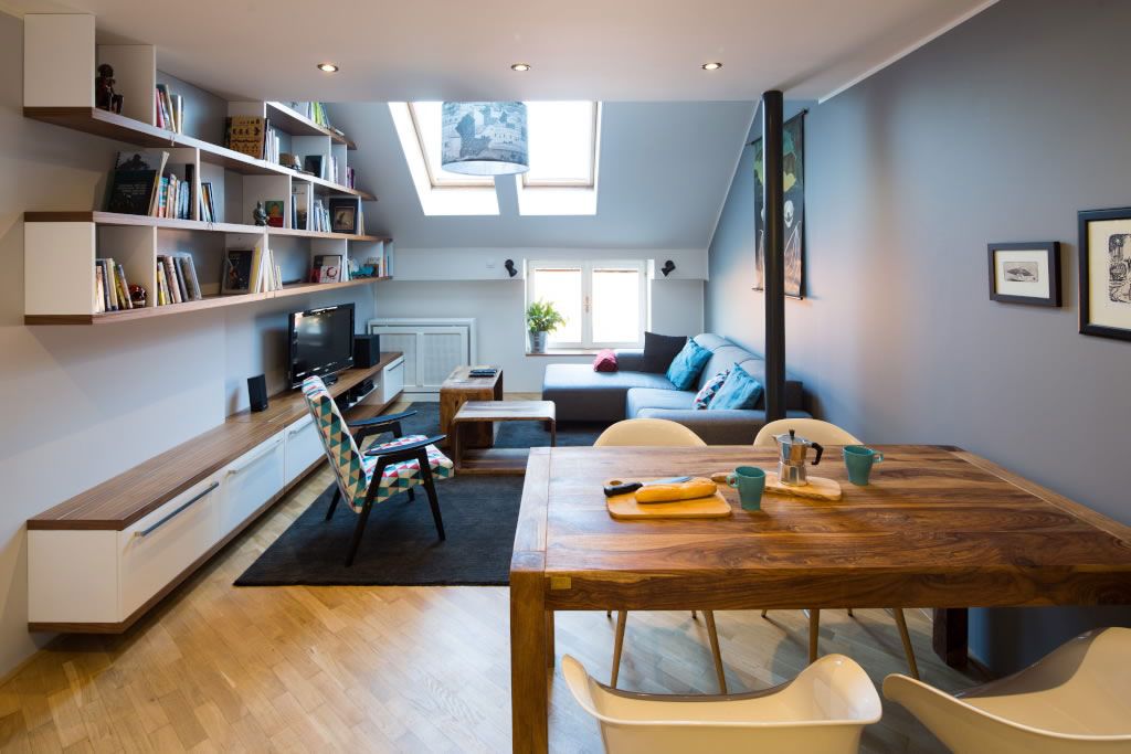 Camera principala sau livingul descrie un decor gandit sa ofere maximum de eficienta intr-o configuratie dificila, cu tavan inclinat. Ferestrele specifice mansardelor aduc un plus de lumina naturala in camera si iti ofera privilegiul de a admira imensitatea cerului. Restul camerei urmeaza o linie minimalista necesara in contextul suprafetei mici.
