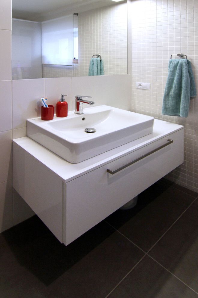 Baia a fost gandita cat mai functional posibil, din nevoia de a integra si masina de spalat rufe. Pe de o parte avem conturata zona de dus, delimitata printr-un perete despartitor de spatiul destinat masinii (vezi modul ingenios prin care este ascunsa atunci cand nu este folosita) si de cealalta parte, spatiul toaletei si al lavoarului.