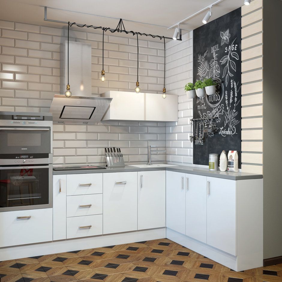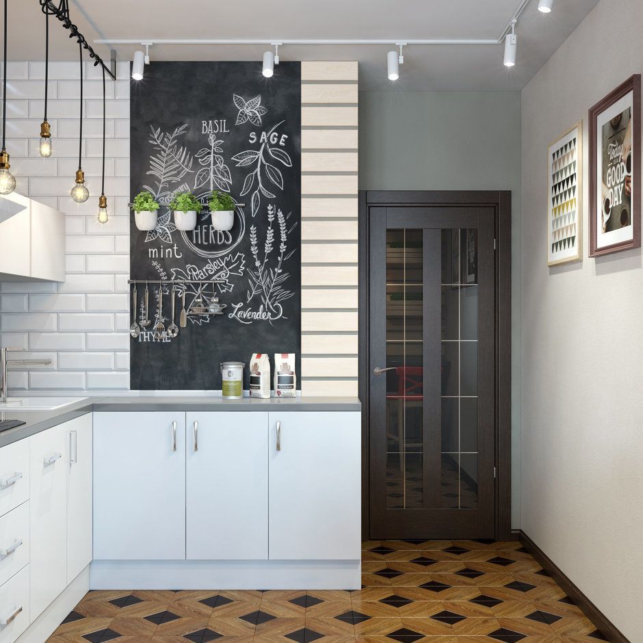 Mutand o parte din depozitare in balcon, s-a dorit ca in bucatarie sa fie eliminate dulapurile din partea superioara. A fost pastrat doar un corp mic, suspendat, folosit ca picurator pozitionat deasupra chiuvetei. Restul peretilor sunt placati cu faianta tip Metro in zonele de gatit si stropit, iar un panou vopsit cu tabla neagra scolara iti ofera loc pentru creativitate.