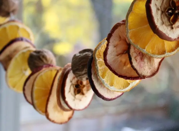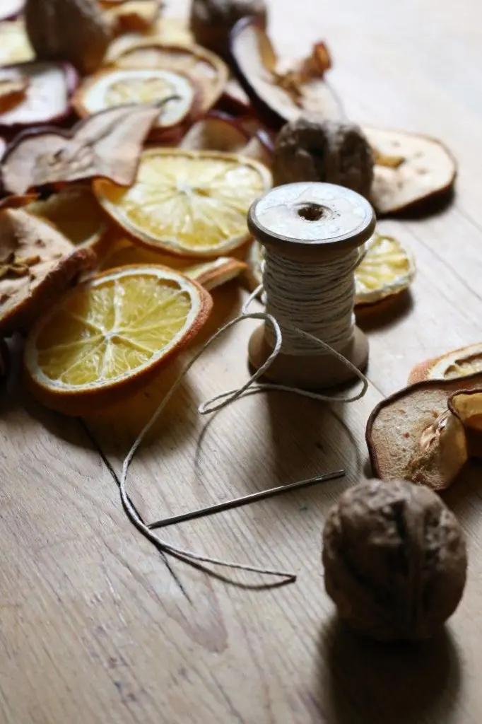 Puteti folosi lamaie, portocala, sau mar; dupa uscare treceti prin mijlocul lor cu un ac cu ata.