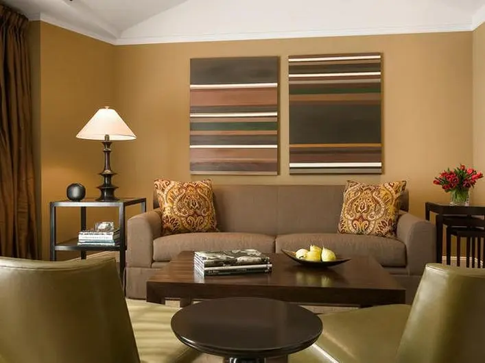 Paleta neutra de culori in tonuri mai inchise. Remarcati jocul liniilor din tablourile de deasupra canapelei si modelul pernelor decorative