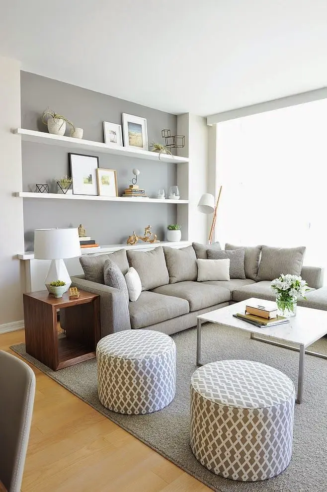 Paleta cromatica de griuri predomina in aceasta amenajare. Remarcati scaunele tip otoman si detaliile decorative care imbogatesc spatiul