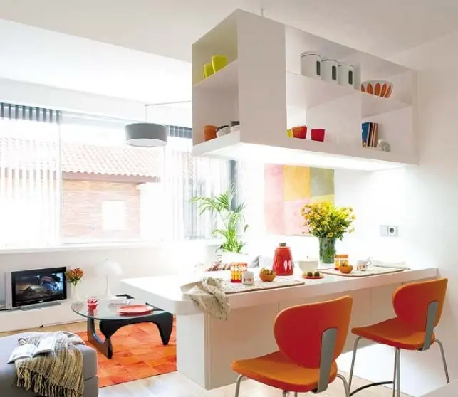 Intr-o garsoniera, cu o astfel de bucatarie, blatul care functioneaza ca bar este o idee practica pentru a oferi loc de luat masa fara a lua prea mult din spatiu.