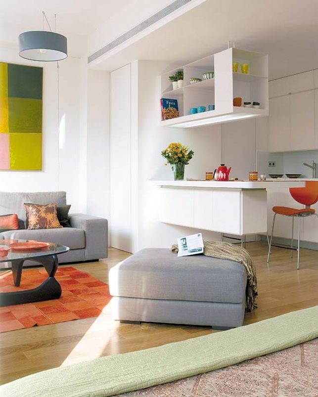 Intr-o garsoniera, cu o astfel de bucatarie, blatul care functioneaza ca bar este o idee practica pentru a oferi loc de luat masa fara a lua prea mult din spatiu.