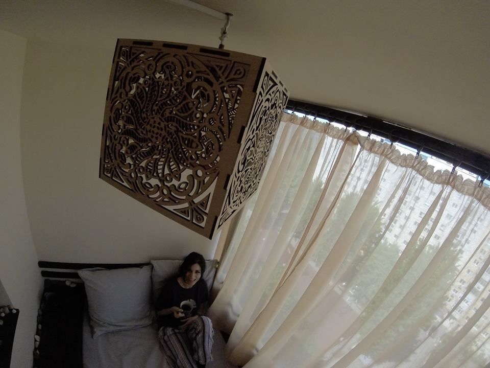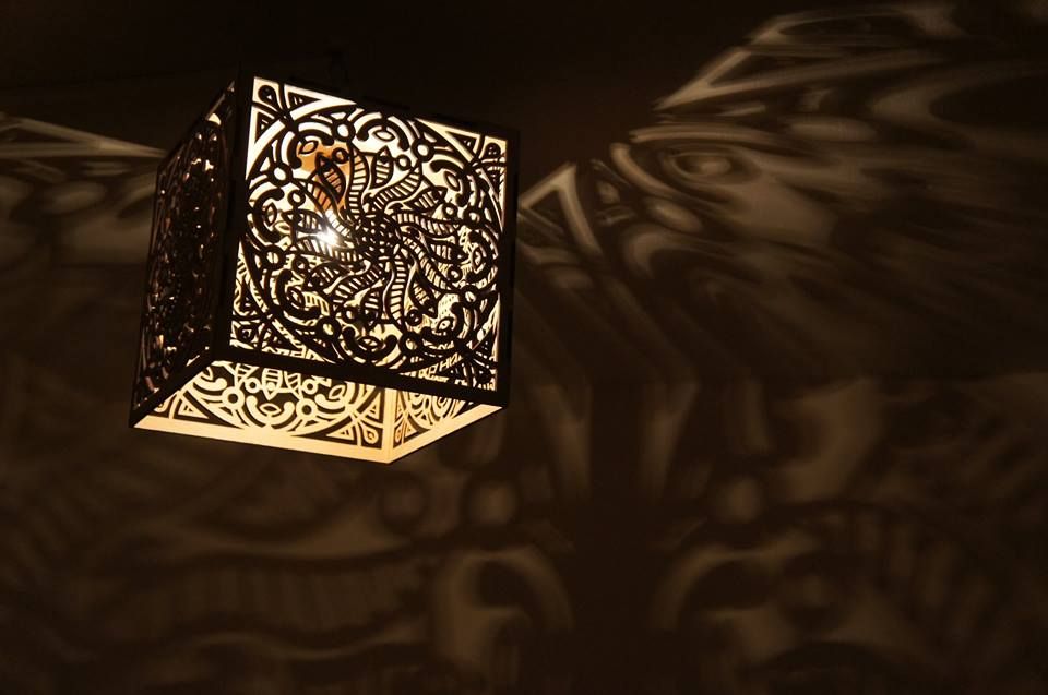 Lustra poate fi una din comert sau, daca esti pasionat si te pricepi sa lucrezi intr-un program de proiectare, poti sa o realizezi chiar tu. Ai nevoie de cinci placi de fag pe care le tai la un atelier specializat dupa modelul creat de tine. La final le asamblezi impreuna cu becul in forma unui cub. Iata rezultatul: