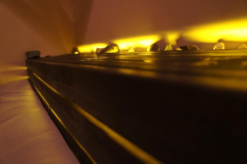Tot din lemn iti poti construi si o polita langa pat pe care sa-ti asezi pietre ornamentale, plante, fotografii sau alte decoratiuni pe placul tau. Lasa intre placutele din lemn un spatiu de 5 mm. Astfel, sub el poti instala spoturi sau alte corpuri de iluminat. Vor avea un efect minunat!