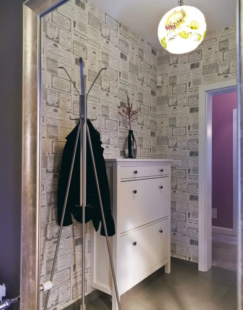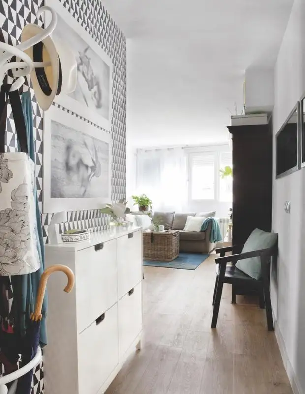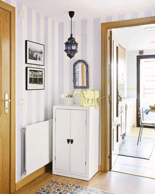Gandeste-te la culori. Poate prima optiune care iti vine minte este albul. E o alegere corecta. Albul reflecta lumina si amplifica spatiul, mai ales intr-o zona precum holul unde nu prea exista o sursa de lumina naturala directa.