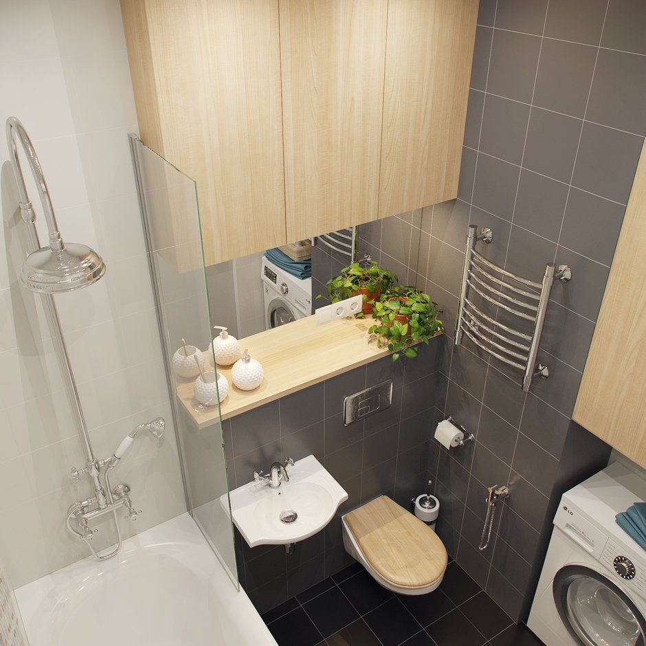 Si amenajarea baii a fost o provocare din nevoia de a introduce si masina de spalat rufe. Solutiile alese permit utilizarea baii in mod optim. Spatiul pardoselii a fost lasat liber (chiar si vasul de toaleta este suspendat). Dulapurile inalte pana in tavan asigura nevoia de stocare a diferitelor produse cosmetice si detergenti. Usa batanta a fost inlocuita cu una glisanta, optimizand astfel spatiul avut la dispozitie.