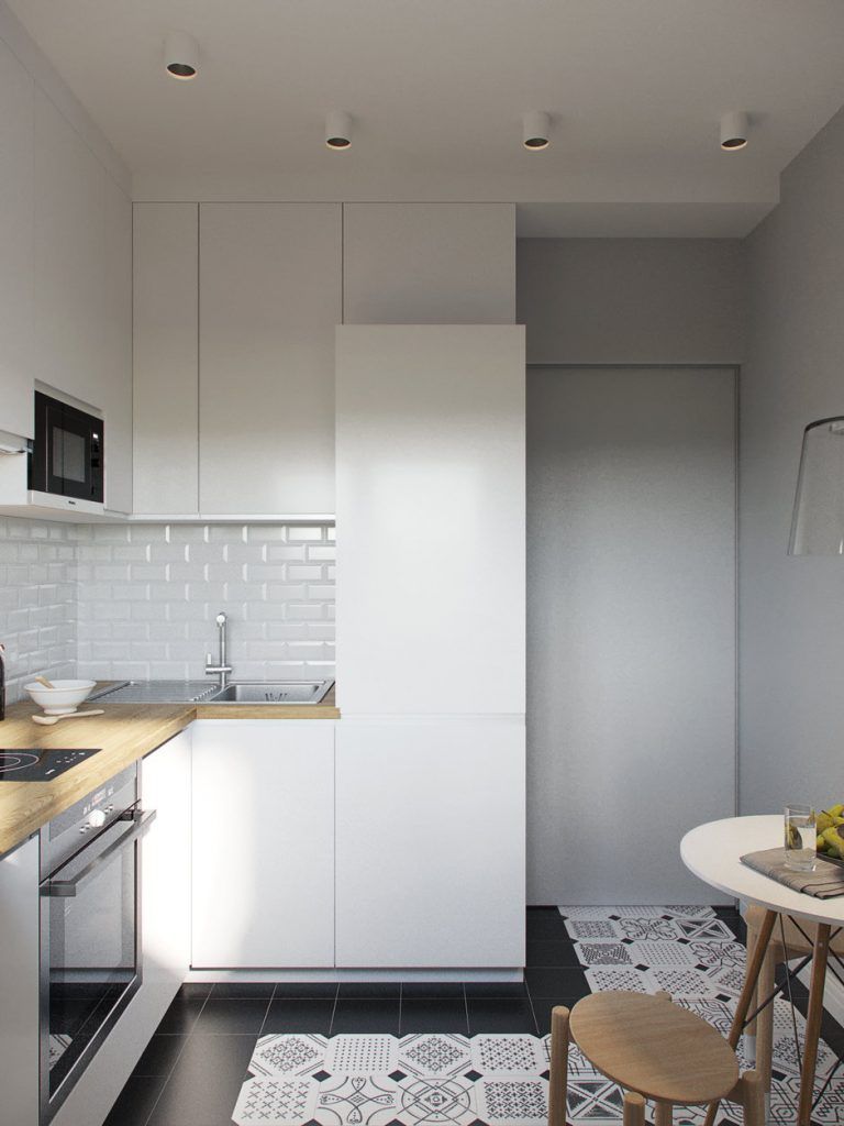 Fiind nevoita sa foloseasca cu precizie fiecare metru patrat, in bucatarie, au fost alese dulapuri inalte pana in tavan, avand astfel mai mult loc pentru depozitare. Albul mobilierului si al placilor ceramice tip Metro este completat de negrul gresiei. Modelul placilor decorative sparg din monotonia spatiului monoton. Blatul de lucru se continua si deasupra caloriferului din dreptul ferestrei pentru un plus de spatiu necesar atunci cand se gateste.