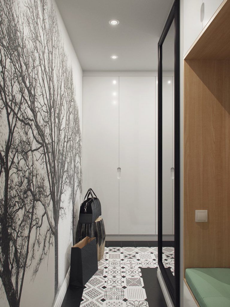 In hol au fost amenajare dulapurile ce preiau principala functie de depozitare din acest apartament. Pentru a distrage atentia de la spatiul ingust, placile decorative din bucatarie se continua si in hol, iar pe peretele de la intrare, fototapetul rupe ritmul monoton al albului. Un alt truc care sprijina decorul holului este oglinda inalta cu rama neagra. Recomandam acest model si chiar si pozitionarea pentru efectul sau de marire a spatiului. Si iluminatul joaca un rol important, fiecare colt primind o cantitate suficienta de lumina.