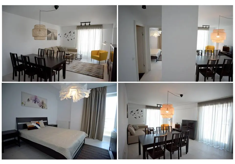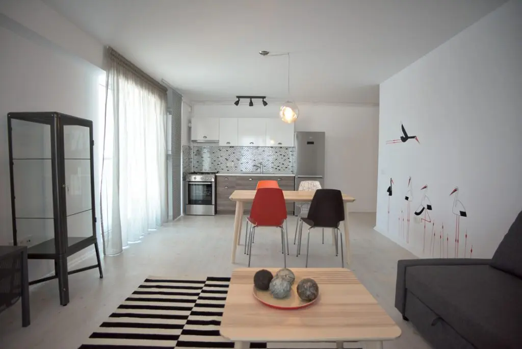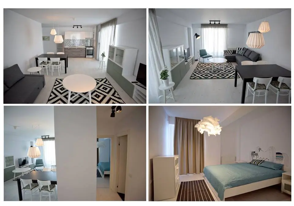 Mentionam ca apartamentele (de 2 camere si o suprafata de60 de metri patrati) fac parte dintr-un ansamblu rezidential si sunt destinate inchirierii. Ele includ finisajele si mobilierul cu electrocasnicele din bucatarie. Cu toate acestea, merita toate atentia noastra pentru ca ele ne pot arata cum putem compila cu un buget prietenos o amenajare frumoasa.