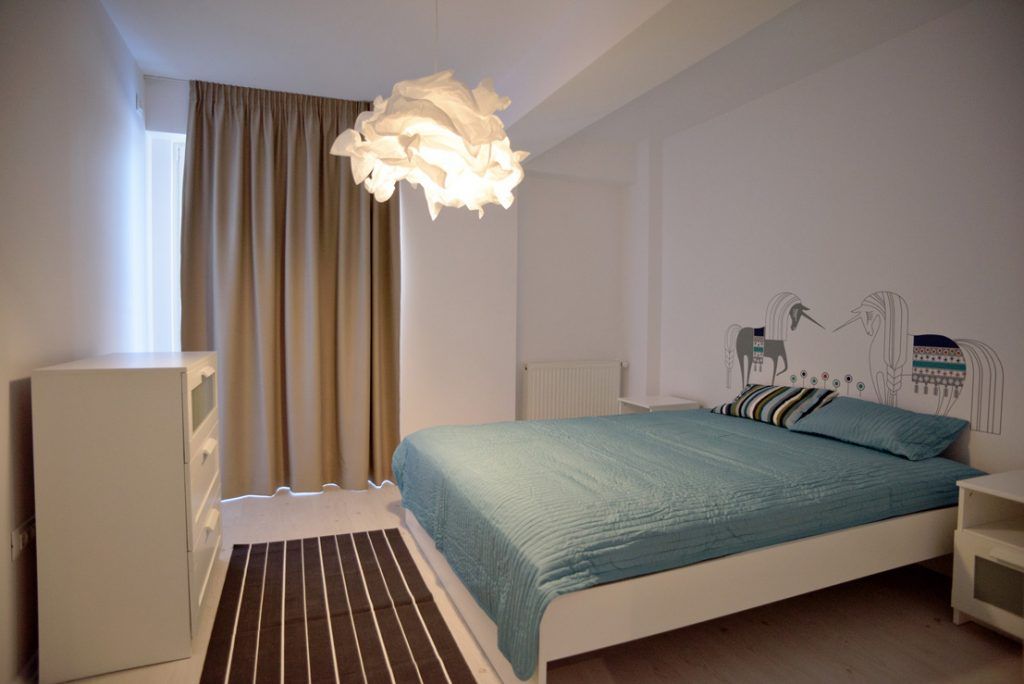 Si dormitoarele pastreaza aceasta linie minimalista a amenajarii concentrata pe functionalitatea spatiilor. Tablourile, corpurile de iluminat, covorul si draperiile decoreaza placut aceste spatii destinate relaxarii.