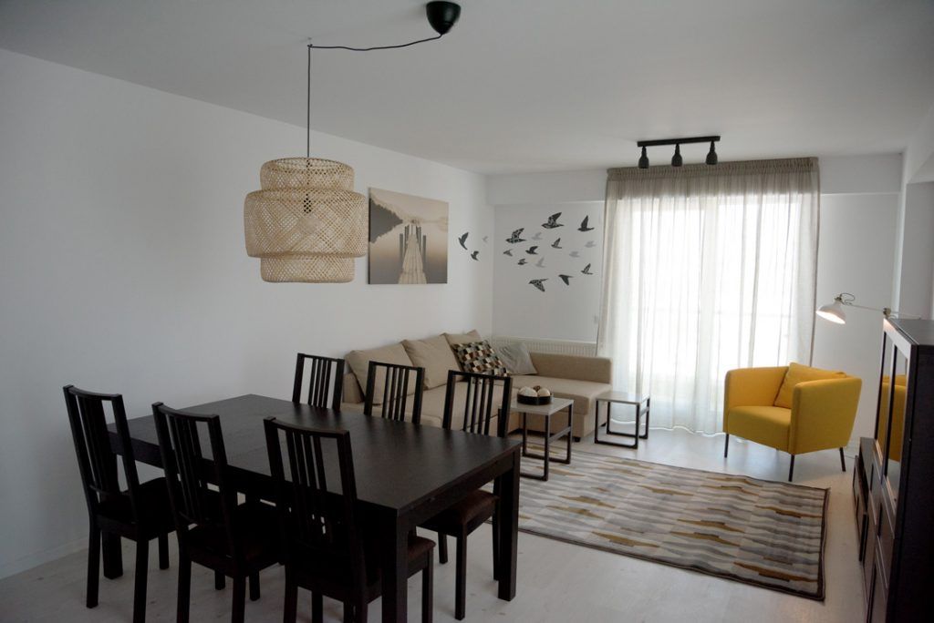Mentionam ca apartamentele (de 2 camere si o suprafata de60 de metri patrati) fac parte dintr-un ansamblu rezidential si sunt destinate inchirierii. Ele includ finisajele si mobilierul cu electrocasnicele din bucatarie. Cu toate acestea, merita toate atentia noastra pentru ca ele ne pot arata cum putem compila cu un buget prietenos o amenajare frumoasa.