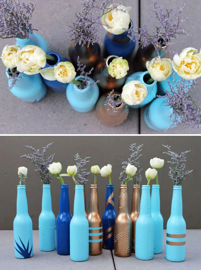 Mai stii sticlele de bere care au ramas dupa petrecerea de acum doua seri? Vor fi perfecte pentru a le transforma in vaze cu diferite culori. Creeaza si un model simplu si vei avea o adevarata opera de arta. Vei putea chiar sa le faci cadou prietenilor.