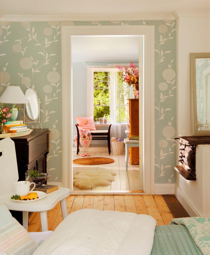 Tapet cu imprimeu floral nuanta discreta face trecerea intre zonele casei