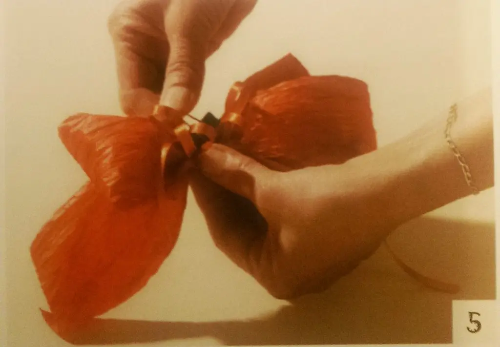 Dintr-o panglica subtire se leaga una sau mai multe funde urmand pasii de mai sus, dupa care se prind de funda mare, legandu-le dupa plac cu panglici sau snururi asortate