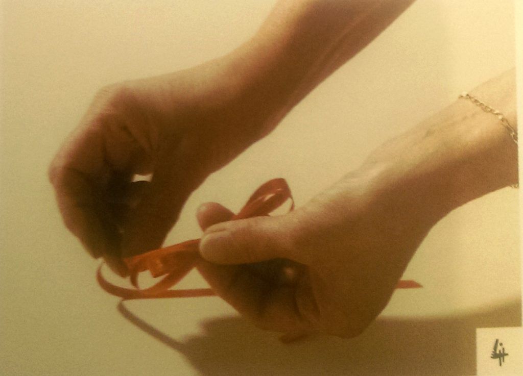 1. Se asaza panglica pe palma stanga (stangacii o vor aseza pe palma dreapta) si se formeaza o bucla pe o parte, apoi pe cealalta la fel ca in imaginea de mai sus. Se prinde panglica de mijloc cu degetul mare si cel aratator. Aceasta este fundita simpla. Pentru fundita dubla se repeta procesul descris mai sus.
