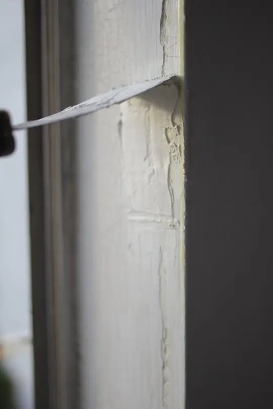 Pasul 2. Cu un spaclu foarte bine curatat, aplica putin chit in zona crapaturilor. Nu aplica foarte mult deoarece s-ar putea sa fie nevoie sa dai dupa aceea cu smirghel si sa iti faci singur munca mai grea.