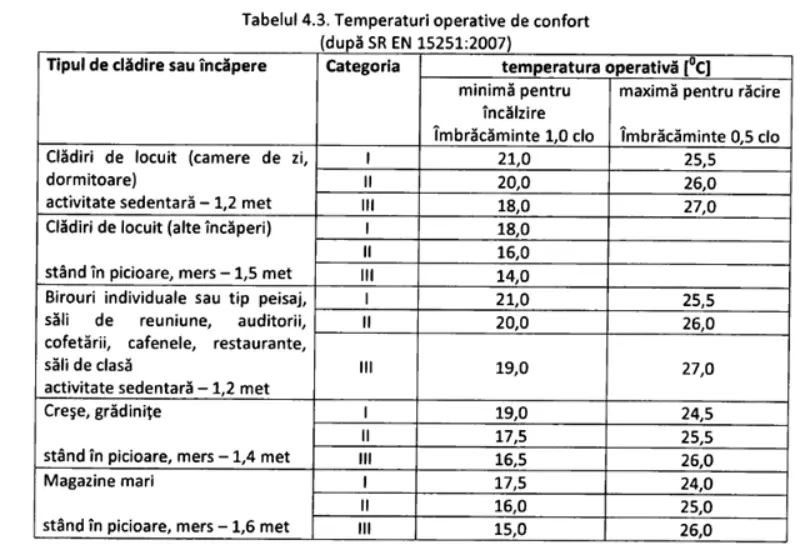 Și mai exact, conform recomandărilor din S R E N 15251: 2007, care sunt impuse prin Normativul I5 2010, din punct de vedere fiziologic, igieniștii estimează că temperatura aerului ce va conveni mediului unui individ așezat, normal îmbrăcat și fără activitate fizică, se situează în jurul valorii de 22°C pe timp de iarnă, și 22-26°C vara, pentru temperaturi exterioare medii. Pentru corpul dezbrăcat se consideră că temperatura optimă este de 28°C. Aceste temperaturi sunt valori medii care trebuie să fie reconsiderate în fiecare caz. În zilele călduroase de vară pentru o ședere de scurtă durată este recomandat să se mențină o temperatură în jurul valorii (20+ exterioară)/2.
