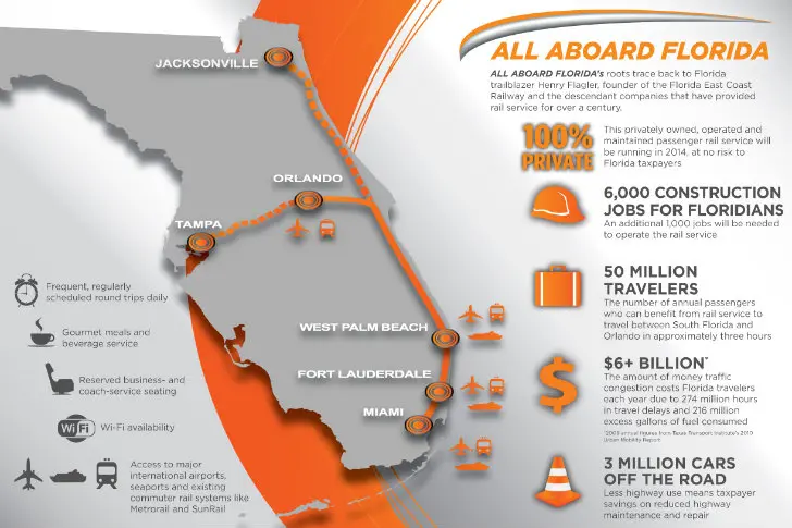 Principalele gari care vor fi reamenajate, incluse in traseul liniei feroviare All Aboard Florida, sunt Orlando, West Palm Beach si Fort Lauderdale, orase care sunt asaltate anual de sute de mii de turisti.
