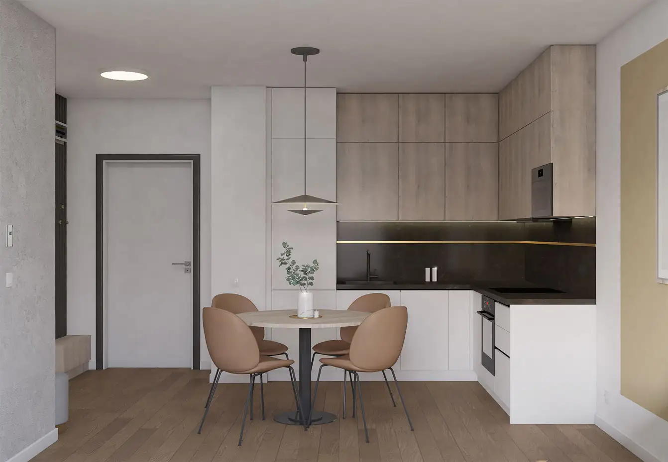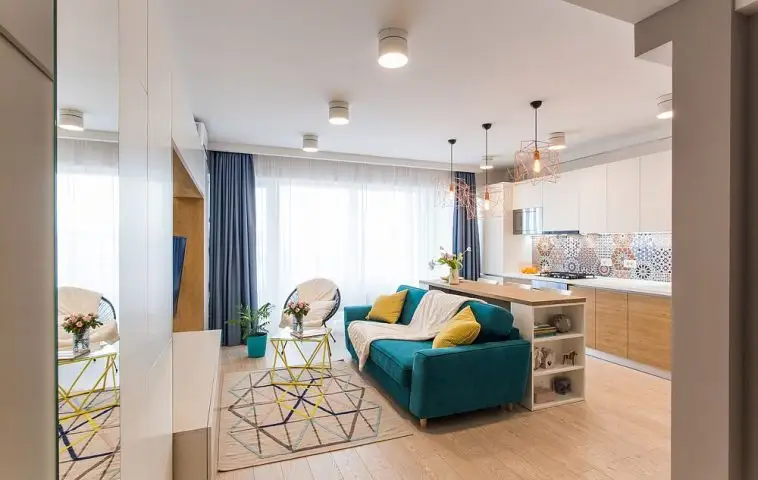 Această regulă previne aspectul rigid. Un interior bine conceput ar trebui să aibă plan apropiat, plan mediu și fundal, ca o pictură. Dacă tragi canapeaua spre centrul camerei, poți pune o consolă îngustă în spatele ei, cu o oglindă sau un tablou deasupra, pentru a umple peretele.