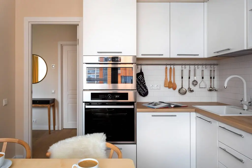 Bucataria a ramas camera de sine statatoare, inchisa. Decorul este simplu, bazat pe alb si accente de lemn care imprima caldura spatiului. Alegand fronturi albe pentru dulapuri, incaperea se pastreaza luminoasa si chiar mai spatioasa. Toate electrocasnicele sunt incorporate pentru a pastra totul unitar si ordonat. Dulapurile sunt inalte, pana in tavan, permitand astfel o depozitare mai eficienta, pe verticala. Tot aici gasim si locul de luat masa, elegant amenajat si pus in valoare cu ajutorul unui corp de iluminat suspendat.