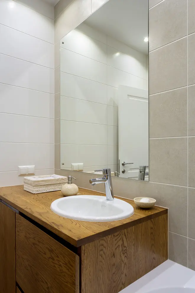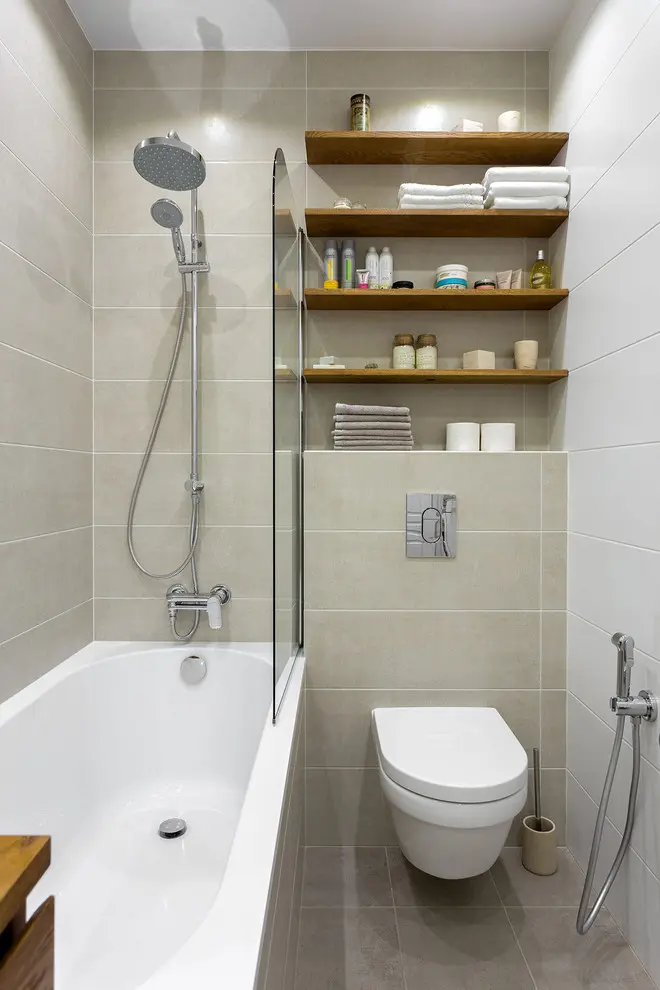 Si baia a fost amenajata pe cat de functional posibil; s-a reusit integrarea unei cazi de baie, a toaletei, si a unor spatii de depozitare atat sub lavoar (unde a fost instalata si masina de spalat rufe), dar si deasupra bazinului incastrat sub forma unor rafturi simple.