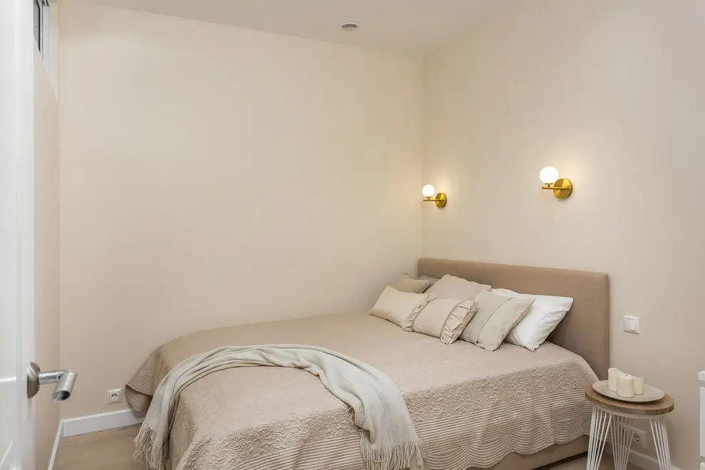 Dormitorul parintilor are doar 8,5 metri patratisi o amenajare pe masura. Suprafata a permis integrarea unui pat matrimonial, a unei comode cu sertare si a doua polite pentru mici decoratiuni sau carti, iar nuanta neutra cu care au fost zugraviti peretii contureaza un ambient placut, relaxant.