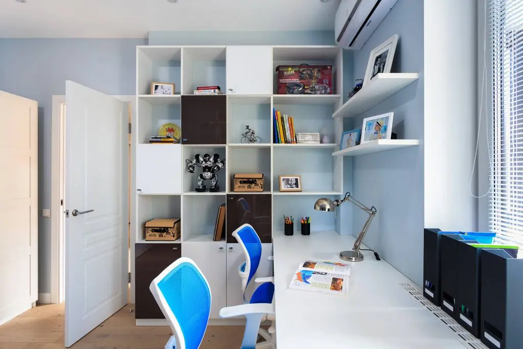 Camera copiilora fost amenajata momentan cu un singur pat, ulterior urmand a fi facute modificarile cu paturi supraetajate. Spatiul este cel mai colorat din apartament, cu mult albastru pe peretele cu tapet; depozitarea este variata, rafturi deschise si un dulap pentru haine. La fereastra a fost gandita zona de birou pentru ambii copii.
