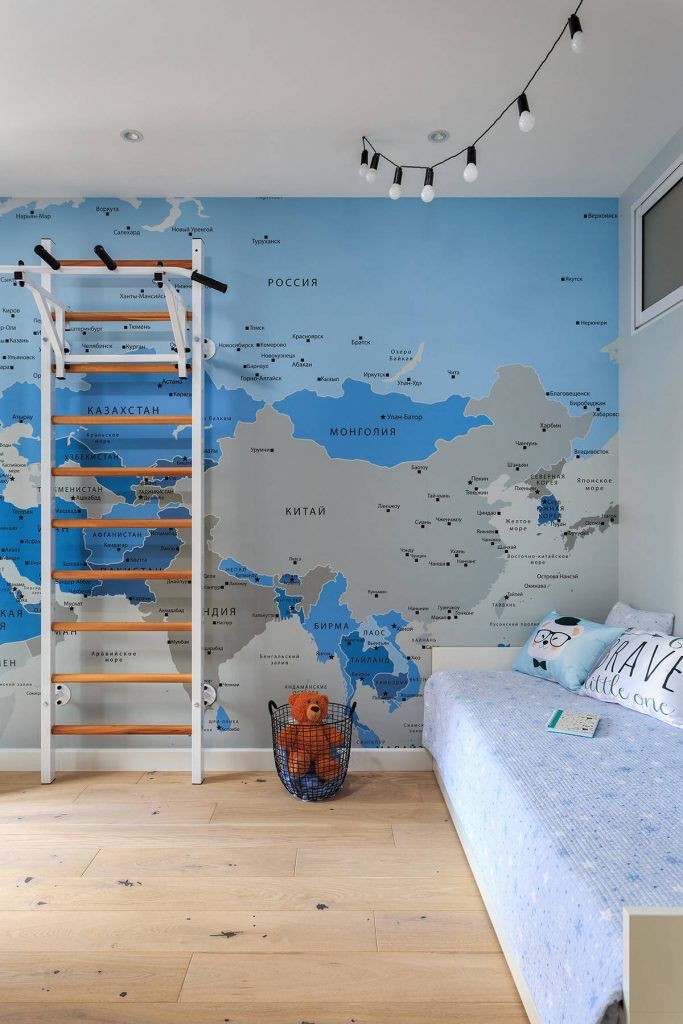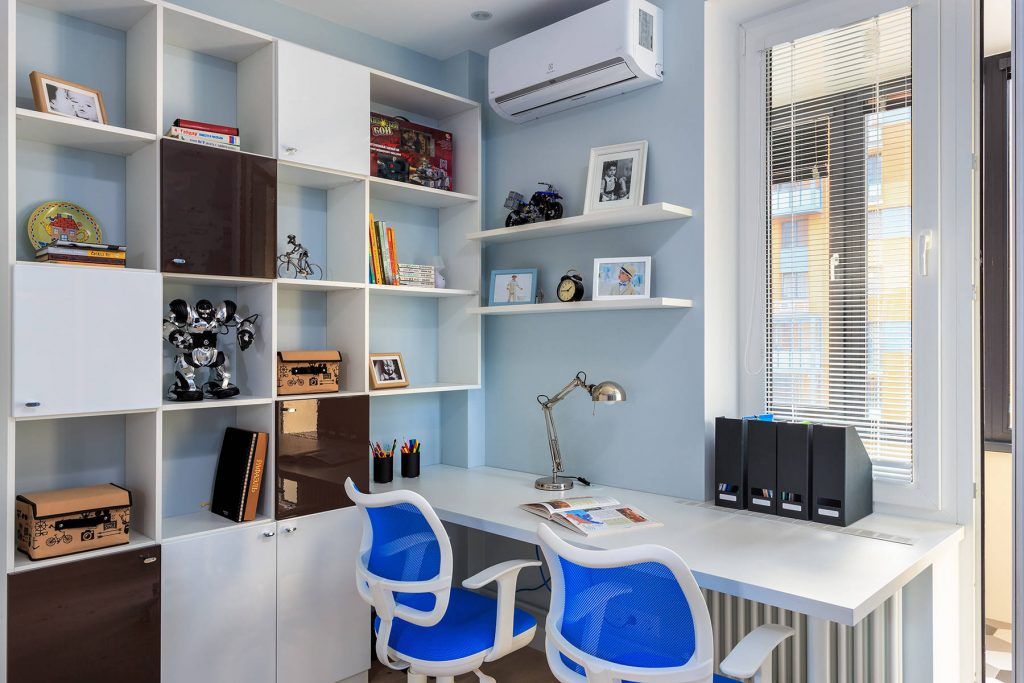 Camera copiilora fost amenajata momentan cu un singur pat, ulterior urmand a fi facute modificarile cu paturi supraetajate. Spatiul este cel mai colorat din apartament, cu mult albastru pe peretele cu tapet; depozitarea este variata, rafturi deschise si un dulap pentru haine. La fereastra a fost gandita zona de birou pentru ambii copii.