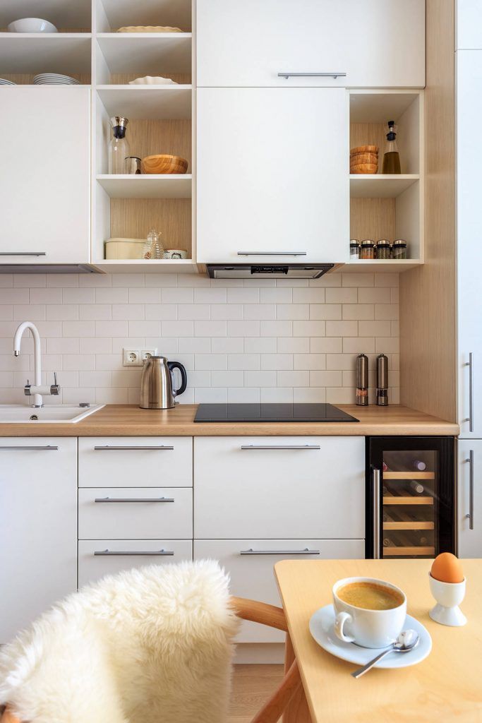 Bucataria a ramas camera de sine statatoare, inchisa. Decorul este simplu, bazat pe alb si accente de lemn care imprima caldura spatiului. Alegand fronturi albe pentru dulapuri, incaperea se pastreaza luminoasa si chiar mai spatioasa. Toate electrocasnicele sunt incorporate pentru a pastra totul unitar si ordonat. Dulapurile sunt inalte, pana in tavan, permitand astfel o depozitare mai eficienta, pe verticala. Tot aici gasim si locul de luat masa, elegant amenajat si pus in valoare cu ajutorul unui corp de iluminat suspendat.